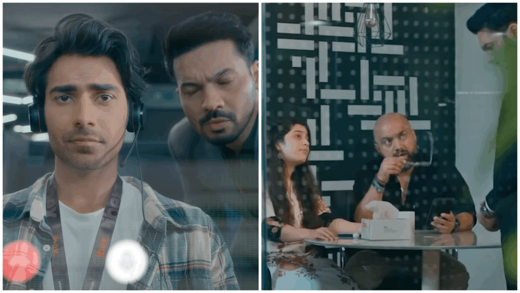 In the first episode, Raeed (Hunaen Shahid) breaks the fourth wall to explain he’s joining IBEX solely to make some quick cash for an electric guitar. He’s laser focused on his musical career. Little does he know that the minute he passes through the gleaming glass doors life is about to change. Corporate indoctrination kicks off as the the series shifts into a recruitment video. Raeed comments about how easy the money is “Intni si call ke derh laakh rupay.”
