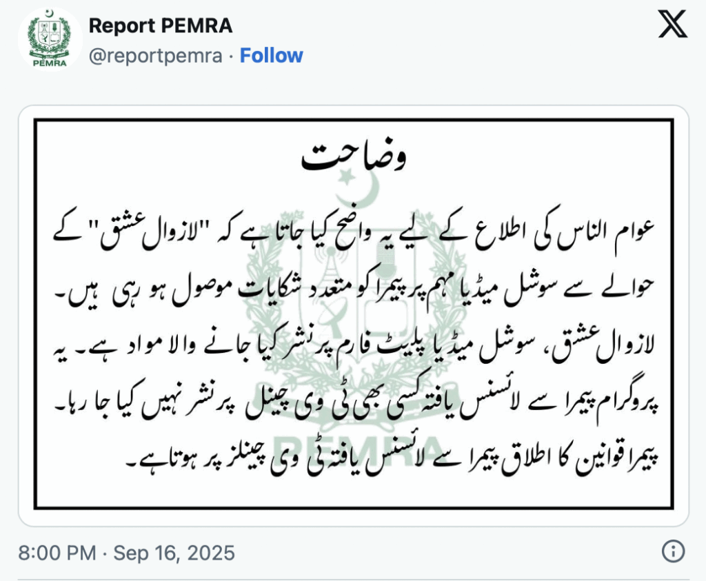 The regulator’s response was measured: “Pemra has received several complaints regarding the social media campaign of Lazawal Ishq. However, the programme is being streamed on social media platforms and is not being broadcast on any Pemra-licensed television channel.”